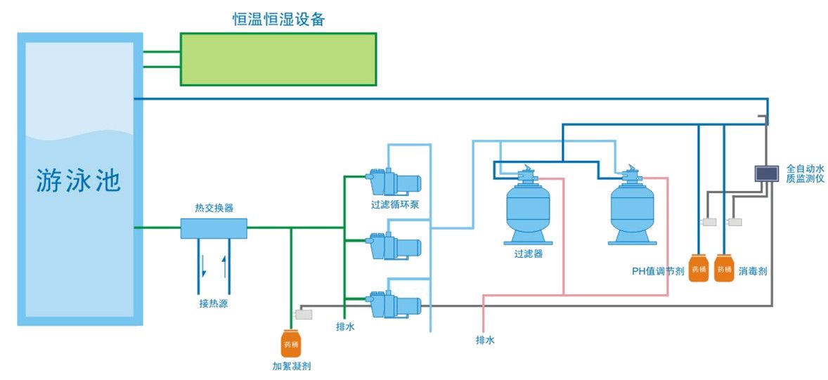 不管你是想要建一個(gè)什么樣規(guī)格的泳池,私人別墅或是酒店水療戲水按摩泳池亦或是學(xué)校比賽的標(biāo)準(zhǔn)泳池,一個(gè)泳池的基本水處理設(shè)備都是大同小異的。