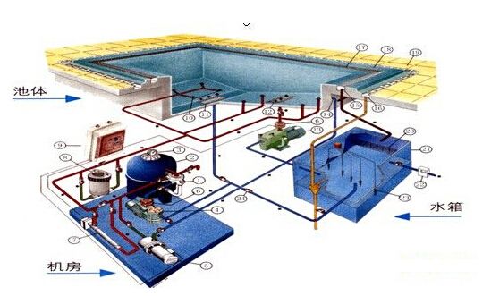 游泳池水質處理系統遵從動態平衡工作原理,在循環處理過程中達到水質的徹底凈化。