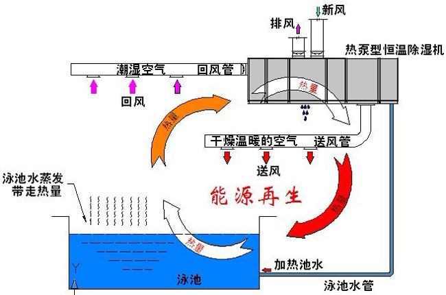 系統利用蒸發器中回收游泳池散發的熱量,通過壓縮機作功再經過回熱冷凝器給空氣回熱,亦可經過池水冷凝器給池水加溫。