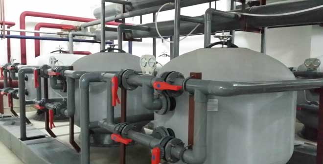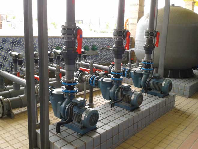 游泳池循環水凈化處理設備機房,一般由均衡水池(或平衡水池)、循環水泵、過濾器、加藥設施、換熱器、消毒設備、化學藥品和助凝劑、特殊設施、系統運行操作控制設備等內容組成。但它會因其游泳池的規模、循環游泳池水凈化設備及流程的不同而有所變化。