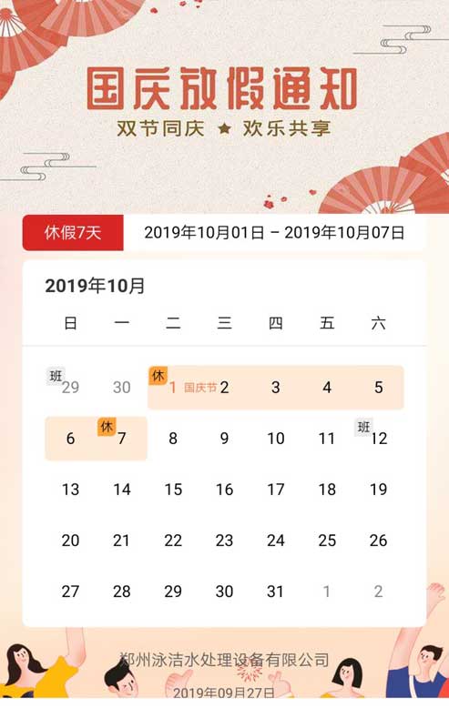 國慶佳節即將到來,根據國務院關于法定節假日的規定和我單位工作實際情況,現將2019年國慶節放假的有關事項通知如下: